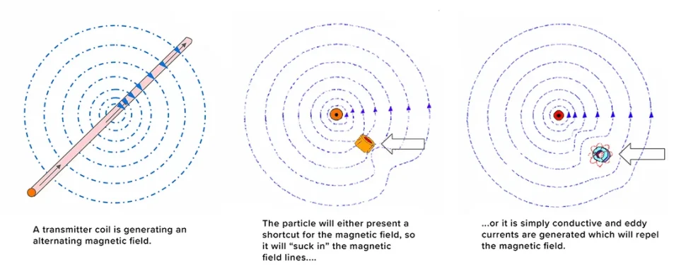 میدان فرستنده را به عنوان یک گروه الگودار از خطوط تصور کنید. وقتی یک آلاینده فلزی از میدان عبور میکند، این الگو را مختل میکند. یک آلاینده مغناطیسی مسیر جدیدی برای دنبال کردن میدان ایجاد میکند و جهت خطوط میدان را تغییر میدهد. یک آلاینده رسانا جریانهای گردابی ایجاد میکند که خطوط میدان مغناطیسی را دفع میکنند. در هر صورت، سیمپیچ گیرنده اعوجاج هندسی میدان فرستنده را تشخیص میدهد و زنگ خطر را به صدا در میآورد و به سیستم تشخیص فلز اجازه میدهد تا محصول آلوده را از جریان فرآیند رد کند.